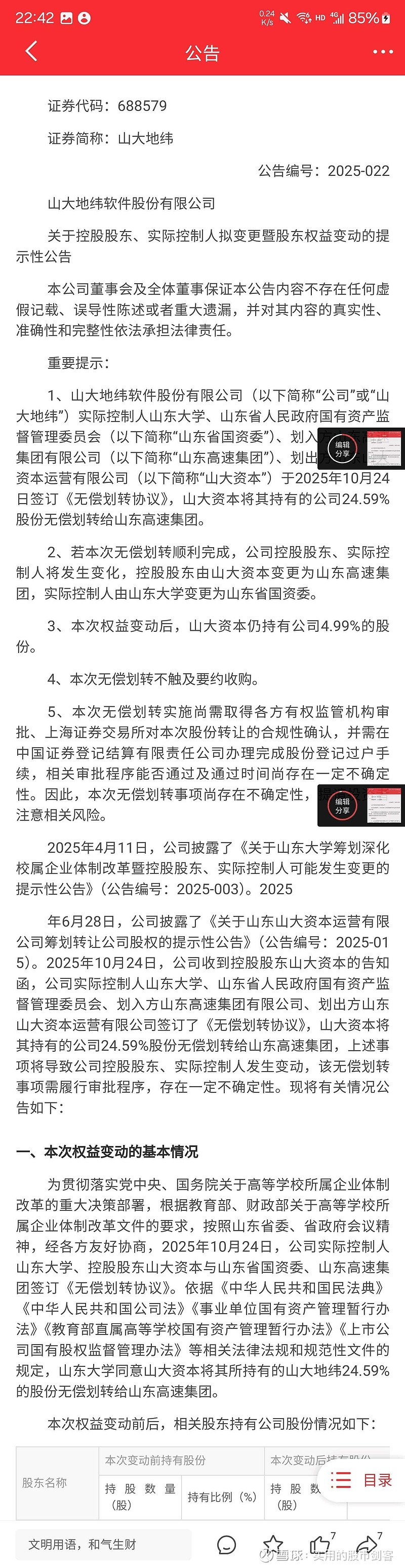 $山高控股(00412)$ 山东国资委又塞了一家上市公司给山东高速集团。$山大地纬(SH688579)$ 原本的实控人是山东大学,今天公告无偿转移其所有股份给山东高速集团。山大地纬的主营业务是给政企机关做内部系统,AI+区块链,还有电力的业务。跟山高控股的部分业务是重合的。看后面山高集团怎么安排山大地纬吧。