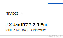 $乐信(LX)$ 小票玩一个,卖出2.5put五手,折合成本2块钱,对应市盈率约等于1(雪球显示不太准确,按雪球算约等于1.5),哈哈,这个市盈率的股票我还是头回(可能)买到。明天要是还跌,就再买点,我等肖某增他那1000w美金的持。这个佣金不知道为啥这么低,五手才2毛4啊。@剑走偏锋_2023 @ChangeForever @喜欢树的夏天