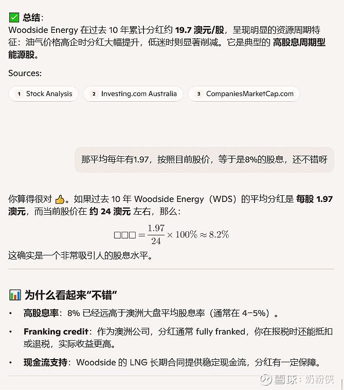 $Woodside Energy(WDS)$ $深证成指(SZ399001)$ $纳斯达克综合指数(.IXIC)$ 作为一个袋鼠人,我知道有一家公司名叫“木头那边儿”,是个挖煤气的,我一直看不上澳股,直到今天才发现,他做生意挺老实的,挣了钱都分给股东,平均股息有8个点哪,如果某年持仓大跌,我归入贫困家庭,还能再退几毛钱的frank的钱,就快到10点了,我准备买点。如果买家不是袋鼠人,就只能拿到分红,拿不到贫困人口的frank,不过分红也还可以啦。@网名叫做夏天的女士 @剑走偏锋_2023