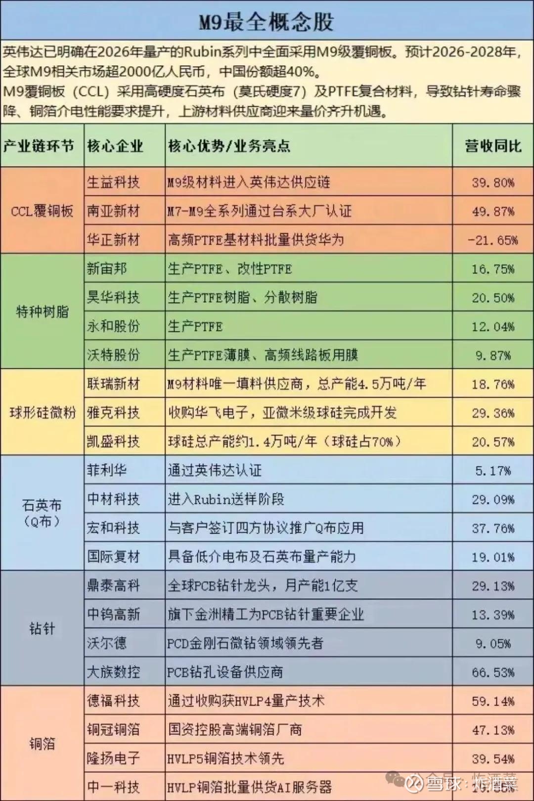 1、关于Q布方案:近两周关于M9+Q布方案确定性提升的信息较多,我们跟踪下来目前方案虽未达到最终拍板确定阶段,#但终端客户认可此次M9方案较之前有进步,信心度的确有回升。几个核心领域材料方案如下:#1)正交背板: 目前M9+Q布、PTFE以及混压方案均在推进,产业端看下来M9+Q方案可能先定,后续也可能有其他方案并行;#2)CPX: 自始至终预期均为M9+Q布,未发生变化;3)Midplane: 早期预期Q布,目前看下来性能略超,预期转为二代布(此事件早已有预期变化,已度过price in阶段,非近期新变化,对Q布不构成利空);#4)SwitchTray: 主要由EMC和生益来做,EMC此前预期二代,目前看预期逐渐转向Q布。生益此前预期Q布,目前看预期转向二代布;我们预计最终可能存在二代布和Q布两种并行方案。5)ComputeTray: 一代布,斗山做,无变化。#6)1·6T交换机: 会有一部分用Q布,看每家具体设计。综合来看,#产业端反馈Q布需求的确仍在持续向上,我们预计26年全市场需求或至少有1.5k-2k万米。铜箔方面,明年hvlp4存供需缺口,铜冠铜箔为国内领先厂商,预计在emc中hvlp4份额拿到3成附近。