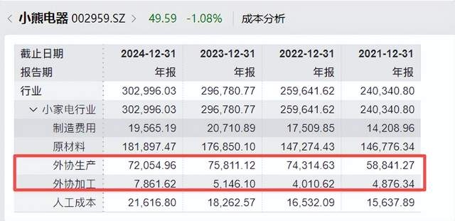 一方面,Wind数据显示,从2021年到2023年,外协生产在小熊总成本中的占比逐渐提高,从23.80%到28.62%,2024年有所下降,但仍占比近1/4。