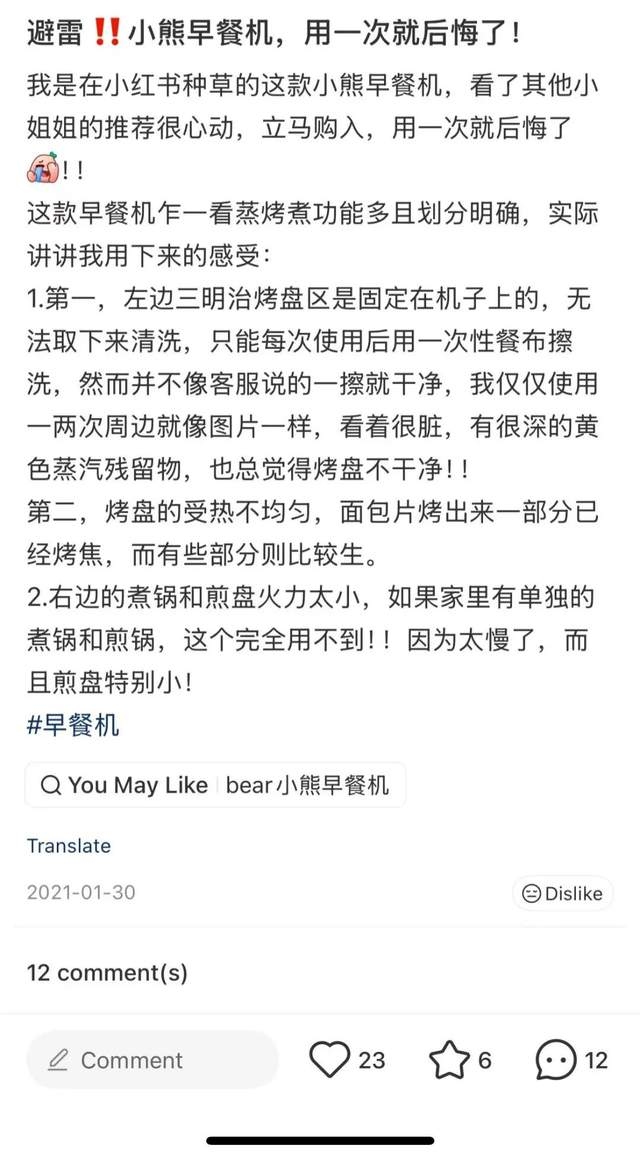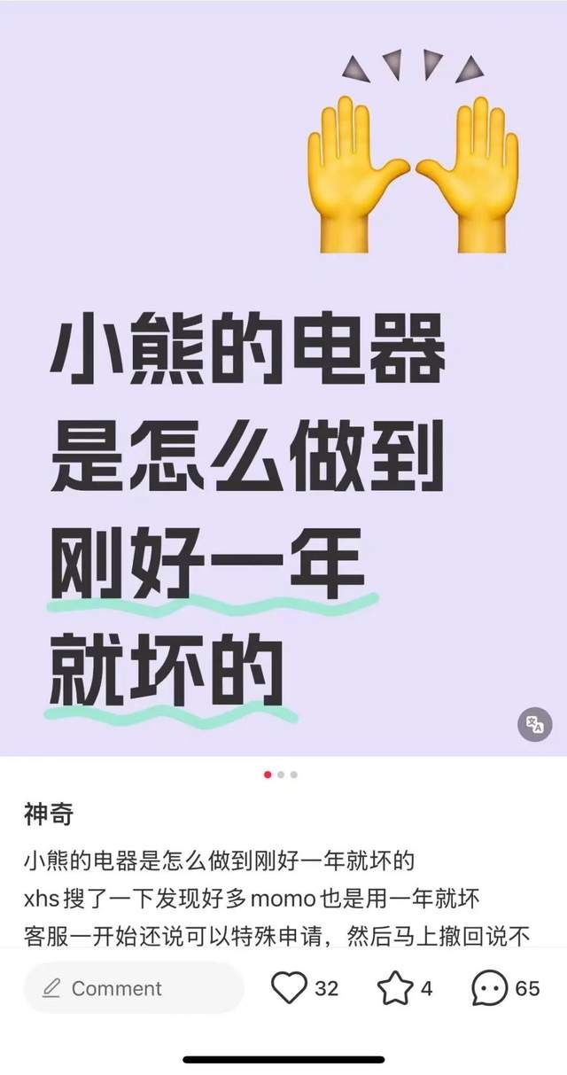 除了养生壶之外,小熊的其他产品也不是“省油的灯”。内衣裤洗衣机漏水,豆浆机“一用就全家跳闸”等问题屡见不鲜,且大多在一年质保期过了之后就坏,因此在不少社交媒体上获封“年抛电器”。