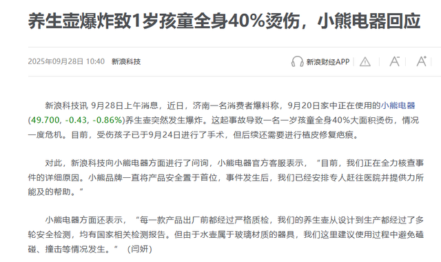 据新浪科技9月28日消息,近日,济南一名消费者爆料称,9月20日家中正在使用的小熊电器养生壶突然发生爆炸,导致一名一岁孩童全身40%大面积烫伤,情况一度危急。