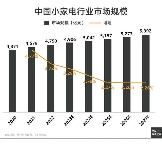 乐观派认为小家电市场无比广阔。一组数据足以证明这一点,尽管疫情过后小家电市场规模整体增速显著放缓,但前景依然广阔,预计2027年市场规模将达到5392亿元。