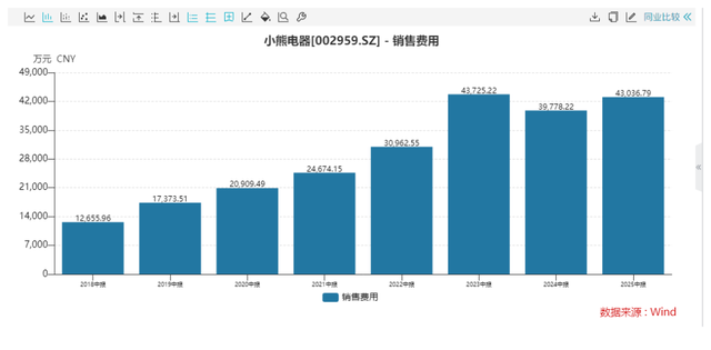 其二是在营销上的慷慨投入。今年上半年,小熊电器豪掷4.3亿,按中报口径,算是上市以来第二大手笔。