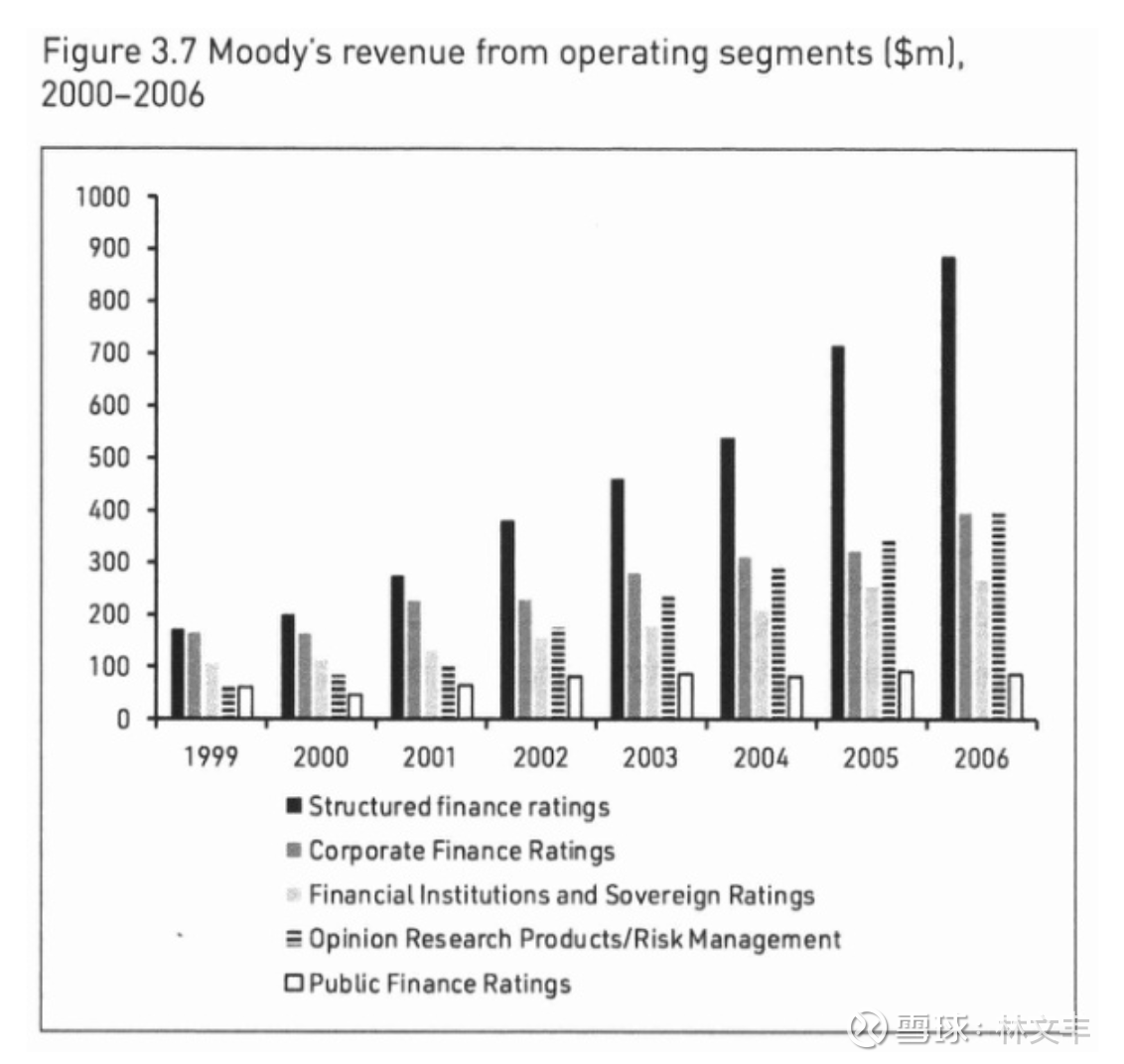 2000年至2006年间收入增长的主要原因是穆迪(Moody's)向那些希望发行以美国住房次级抵押贷款为支撑的证券化债券的客户提供了相关服务。图3.7所示的“结构化金融”业务主要涉及次级债券评级,但也包括以信用卡应收款、商业地产和汽车贷款为担保的债券。