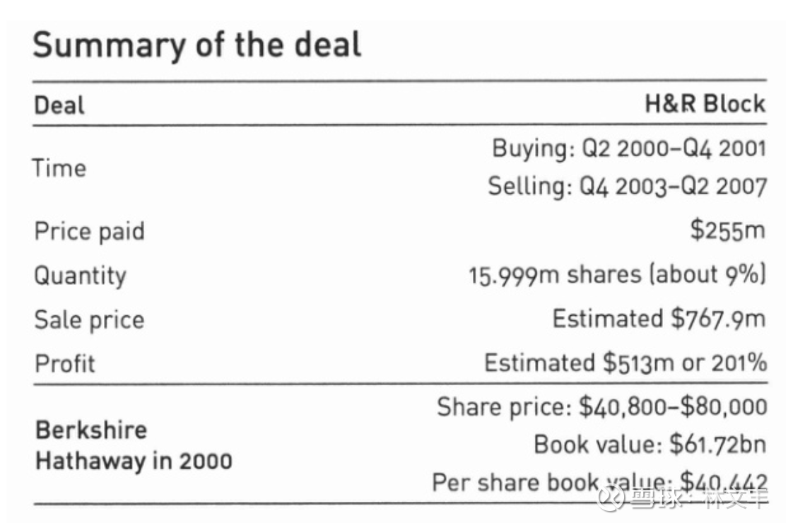 在2001年期间,H&R Block的股价翻了一番多。巴菲特一定对自己的这一连串买入决策感到非常满意。但是,到2001年年底,股票的市盈率是44.7/1.50=29.8——对于巴菲特来说,这太贵了,因此他停止了买入。在仅仅3.4%的收益收益率的情况下,它对未来的收益增长定价过高。