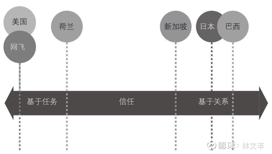 关于信任维度(第五个维度)的比较也让我们印象非常深刻。在网飞文化中,任务导向型特点非常明显,几乎高于所有的目标文化。我们将这一维度放大,同时加上美国文化,从中可以看到该维度呈现的差异(见下图)。