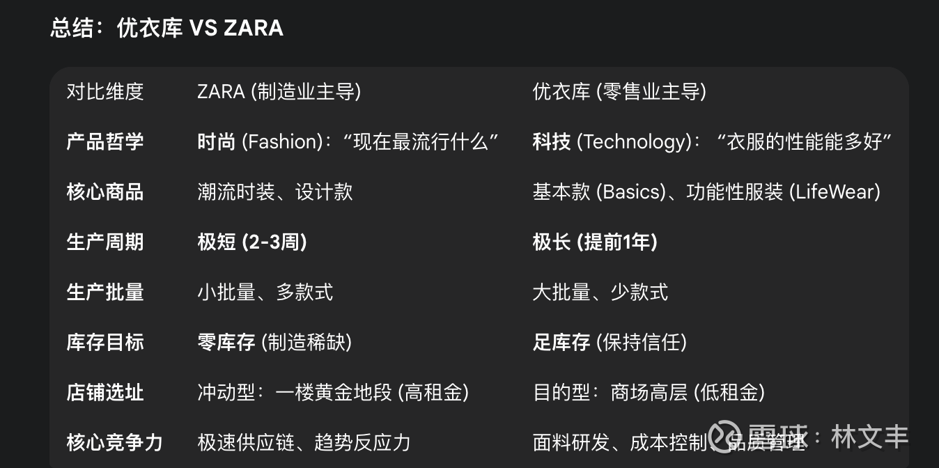 ZARA 是“制造业主导”的时尚公司。优衣库=“基本款×功能面料×计划型生产”:以 HEATTECH/AIRism 等功能材质做大单品、提前锁定大批量(再配合少量追加和周期性“限时价”清理库存);