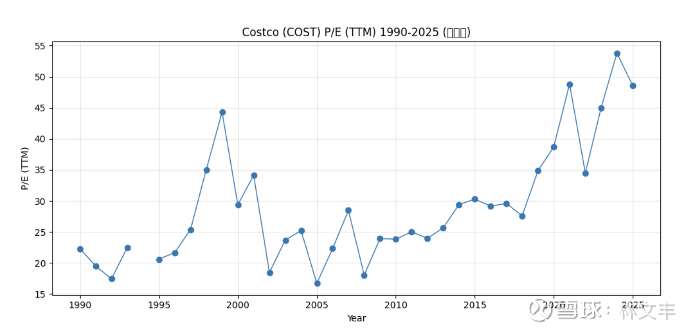 **2019–2025:**再度“提估值”,波动显著加大(2019: 34.85;2020: 38.70;2021: 48.84;2022: 34.50;2023: 45.01;2024: 53.80;2025: 48.58)。
