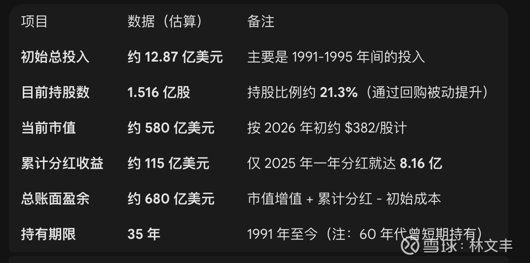 盈利表现: 截至 2026 年,伯克希尔持有的美国运通市值已接近 580 亿美元,而其原始成本仅约 13 亿美元。加上数十年来源源不断的分红,这笔投资的利润早已突破 500 亿美元。