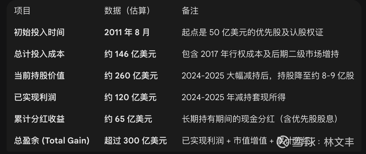 剩下的都是“白赚”: 截至目前,伯克希尔仍持有约 5.68 亿股。这意味着巴菲特不仅收回了全部 146 亿美元 的投资本金,还额外赚取了数百亿美元的现金利润,目前剩余持有的股票市值(约 290 亿-320 亿美元)在账面上完全属于“纯利润”。