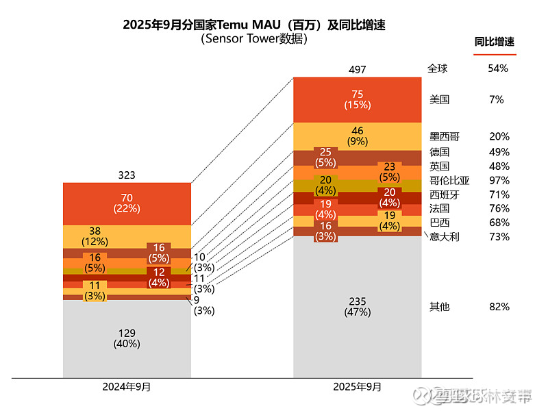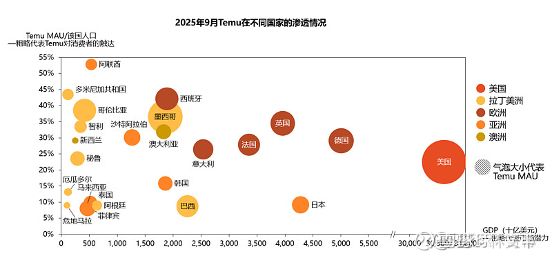 Temu 全球MAU 5亿(拼多多 7 亿),同比增长54%,其中美国MAU相比去年只同期增长7%,增长主要都在其他国际市场从用户数上看。绝大部分发达国家Temu的MAU已经覆盖了国家30%人口。