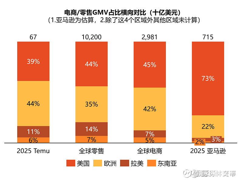 分区域看美国:欧洲:其他=3.5:4:2.5,1)美国在今年这么折腾的情况下,依然实现了25%的增长,对比Sensor Tower美国MAU增加9%,能得出美国的单MAU贡献GMV在增长的大致趋势,且估算9月实现盈亏平衡;2)欧洲在2025年快速增长,已经占Temu GMV的40%,超过美国,并估算10月英国盈亏平衡,3)区域分布上与全球电商分布接近,比亚马逊更偏重欧洲和拉美。