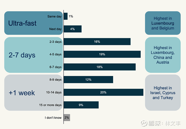 配送时效分布(跨境整体):最常见时效:4–5天(19%) 与 10–14天(20%)。“超慢件”改善明显:15天以上的占比从 2020年的29%降到2025年的7%(意味着以前消费者愿意等一个月,现在等两周都嫌慢,所以做海外仓对于商家越来越必须了)