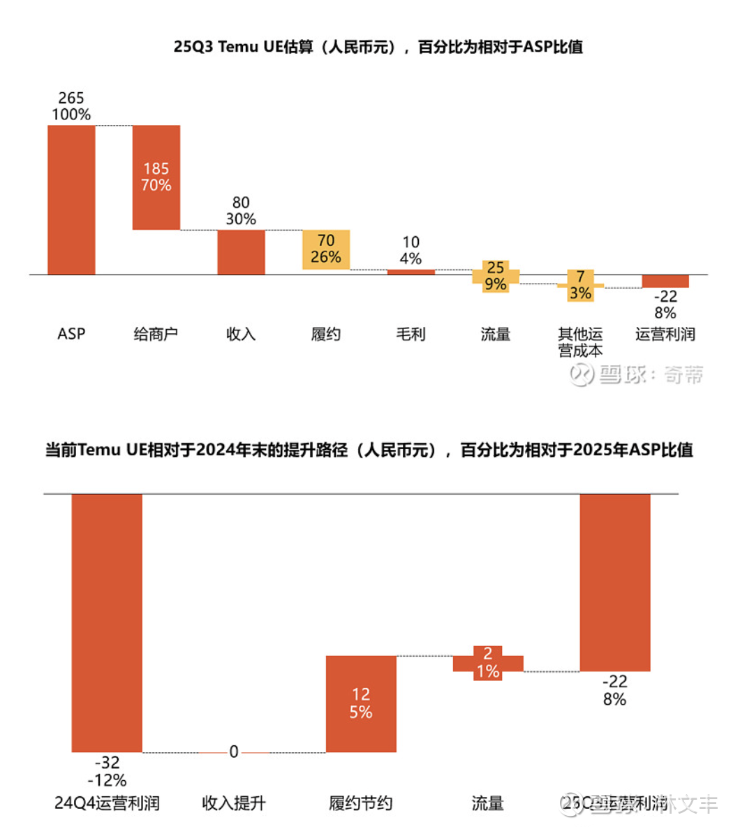 关于UE的估算市场上差异很大,一个差不多的估算:当前整体“Take rate”30%,相对于GMV的运营利润率-8%左右,相比2024年末的-12%有所提升;相对于2024年的UE提升主要来自履约能力的提升,而每单净收入几乎不变(受区域扩张带来的均摊效果和托管模式占比切换)、流量成本略增加(新区域扩张等)影响。由于UE的估算差异大,所以对于Temu每年到底亏了多少钱也存在差异,2025年亏损在5百亿是合理的,原因如下:1.GMV和Take rate作为Topline的指标是容易调研的,有数据可以交叉验证;2.主要差异在履约和流量的预估上,3.2025年整体由于美国有关税引发的波动(Q3开始打平)、其他市场正在开拓市场(英国Q4开始打平),2025相对于2024亏损率未收窄且亏损GMV的个位数百分比相对合理。$拼多多(PDD)$ $亚马逊(AMZN)$ $阿里巴巴-W(09988)$