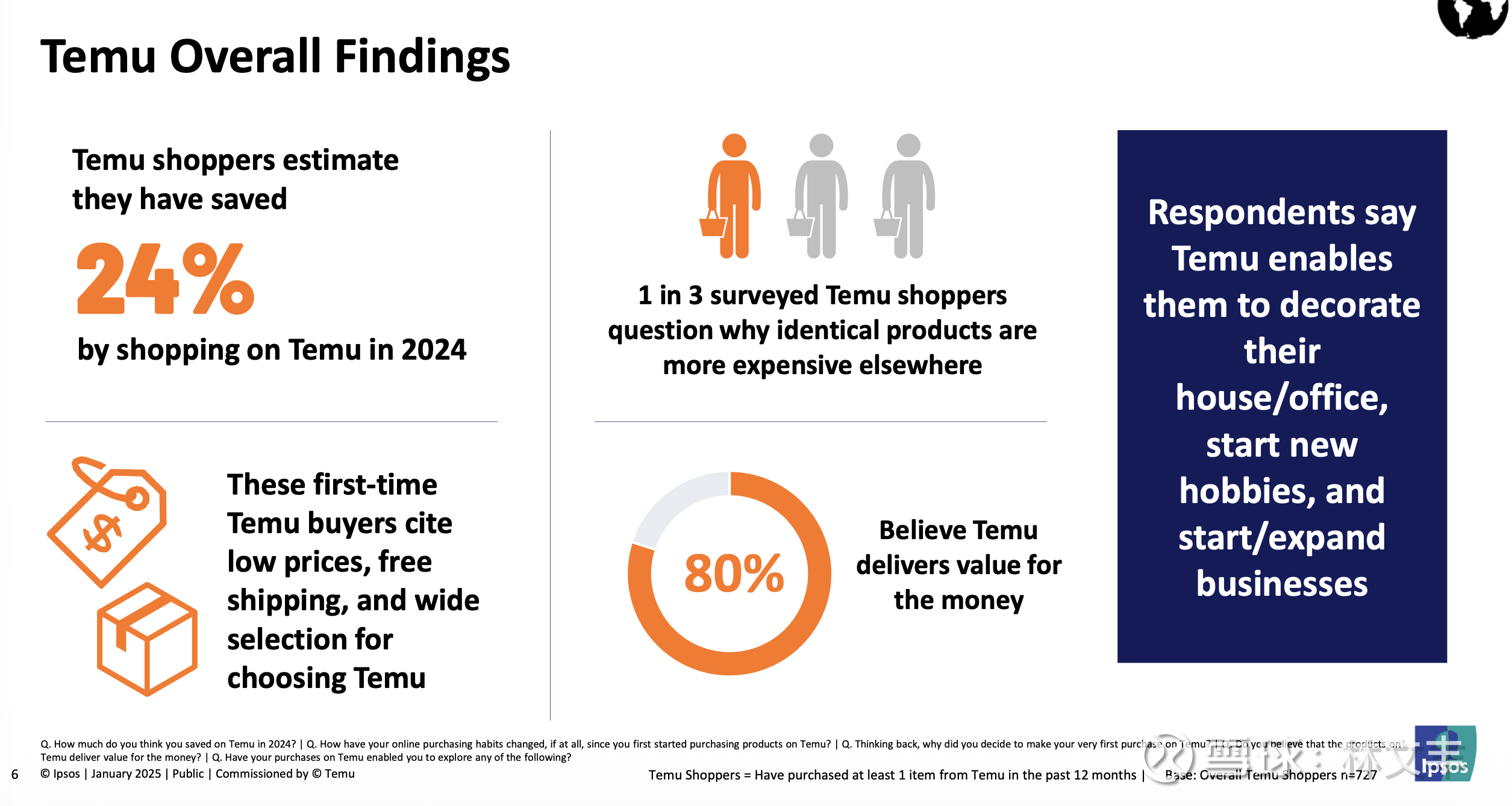 Temu 的跨境电商使用比率从 2022 年“不到1%”升至 2025 年 24%,并且成为“与亚马逊并列的最常用跨境电商平台”。