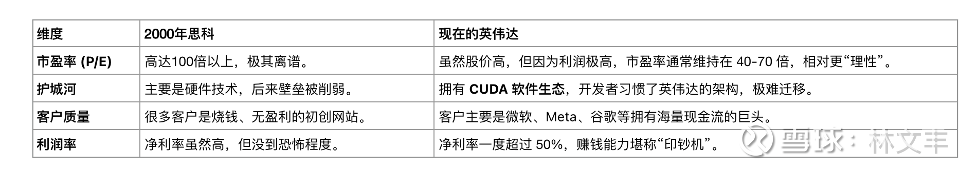 维度2000年思科现在的英伟达市盈率 (P/E)高达100倍以上,极其离谱。虽然股价高,但因为利润极高,市盈率通常维持在 40-70 倍,相对更“理性”。护城河主要是硬件技术,后来壁垒被削弱。拥有 CUDA 软件生态,开发者习惯了英伟达的架构,极难迁移。客户质量很多客户是烧钱、无盈利的初创网站。客户主要是微软、Meta、谷歌等拥有海量现金流的巨头。利润率净利率虽然高,但没到恐怖程度。净利率一度超过 50%,赚钱能力堪称“印钞机”。