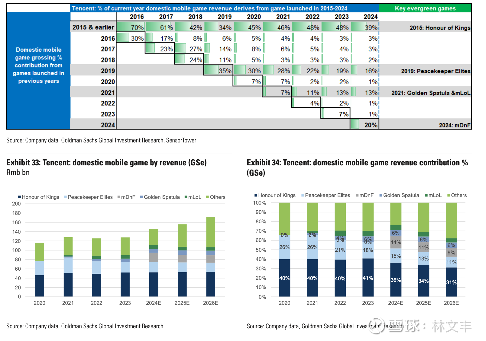 如果按行阅读,该图表显示特定年份推出的游戏及其贡献随时间的衰减情况,例如,2019行表示2019年推出的游戏(主要是和平精英)在2019年占腾讯国内移动游戏总收入的35%,到2024年这一比例降至16%;2) 如果按列阅读,则显示某一特定年份中,来自过去年份的长青游戏对该年游戏收入的贡献,例如,2024列表示39%的游戏收入来自2015年发布的游戏(HOK),20%来自2024年发布的游戏(mdnF)。$腾讯控股(00700)$