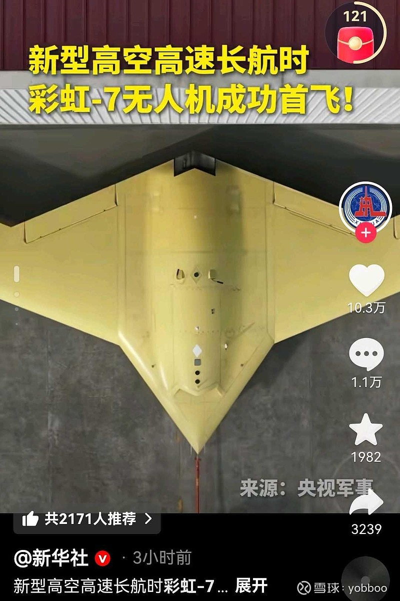 $光启技术(SZ002625)$ 彩虹 - 7高空高速隐身无人机拥有多项突破性特殊技术,隐身性能达国际先进水平,其隐身材料由光启技术提供。