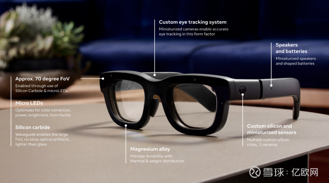 从硬件配置上看,Orion拥有7个摄像头、定制芯片、碳化硅光波导镜片、Micro LED微型显示器。