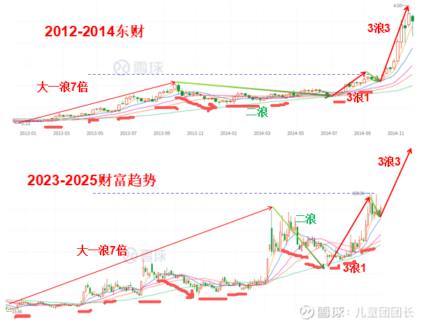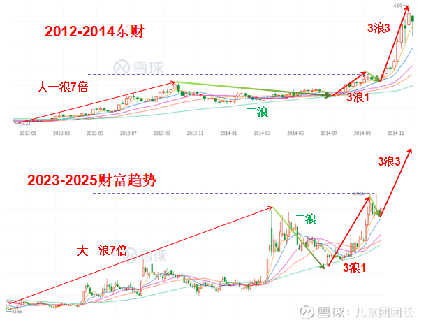 两者都是在大部分个股熊市下跌的时候就开始上涨,通过一个超长的大一浪先涨7倍。