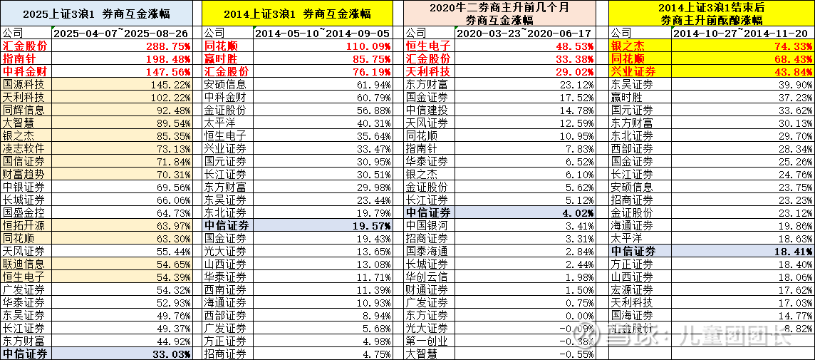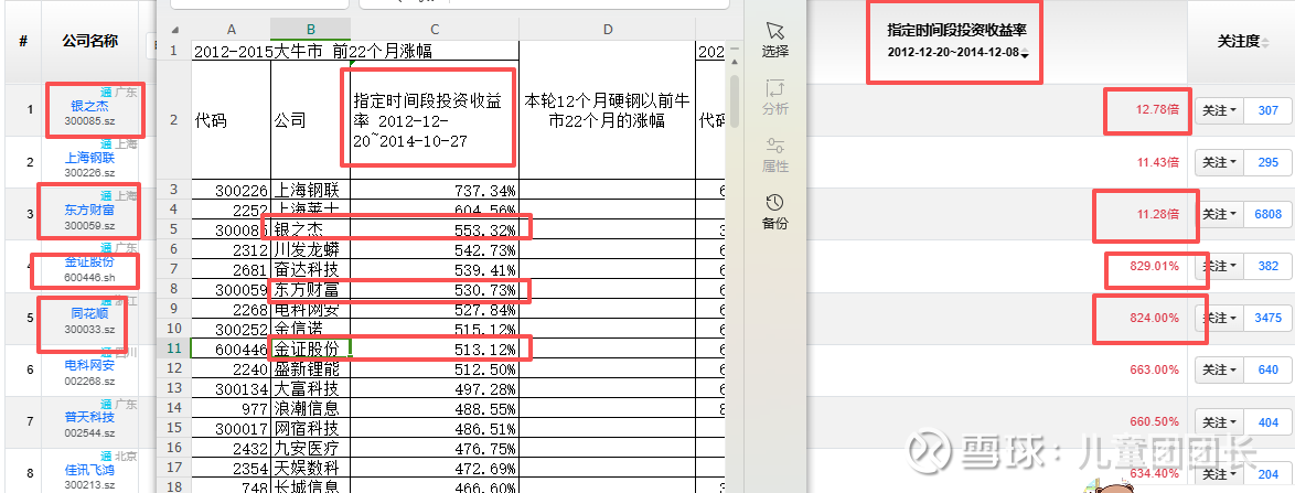 2014年,2012年12月20日牛市起点-2014年10月27日券商主升最后13个交易日之前,全场股票涨幅,前11只互金占4只。