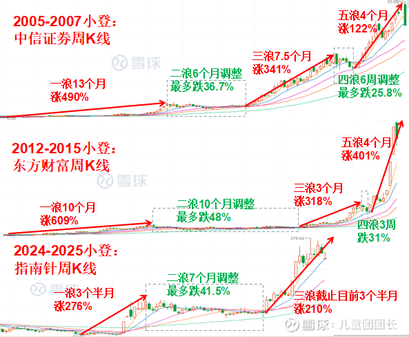 12年一浪涨幅非常牛逼的东方财富,05年涨幅比较牛的中信,在三浪中依然涨幅300%以上。
