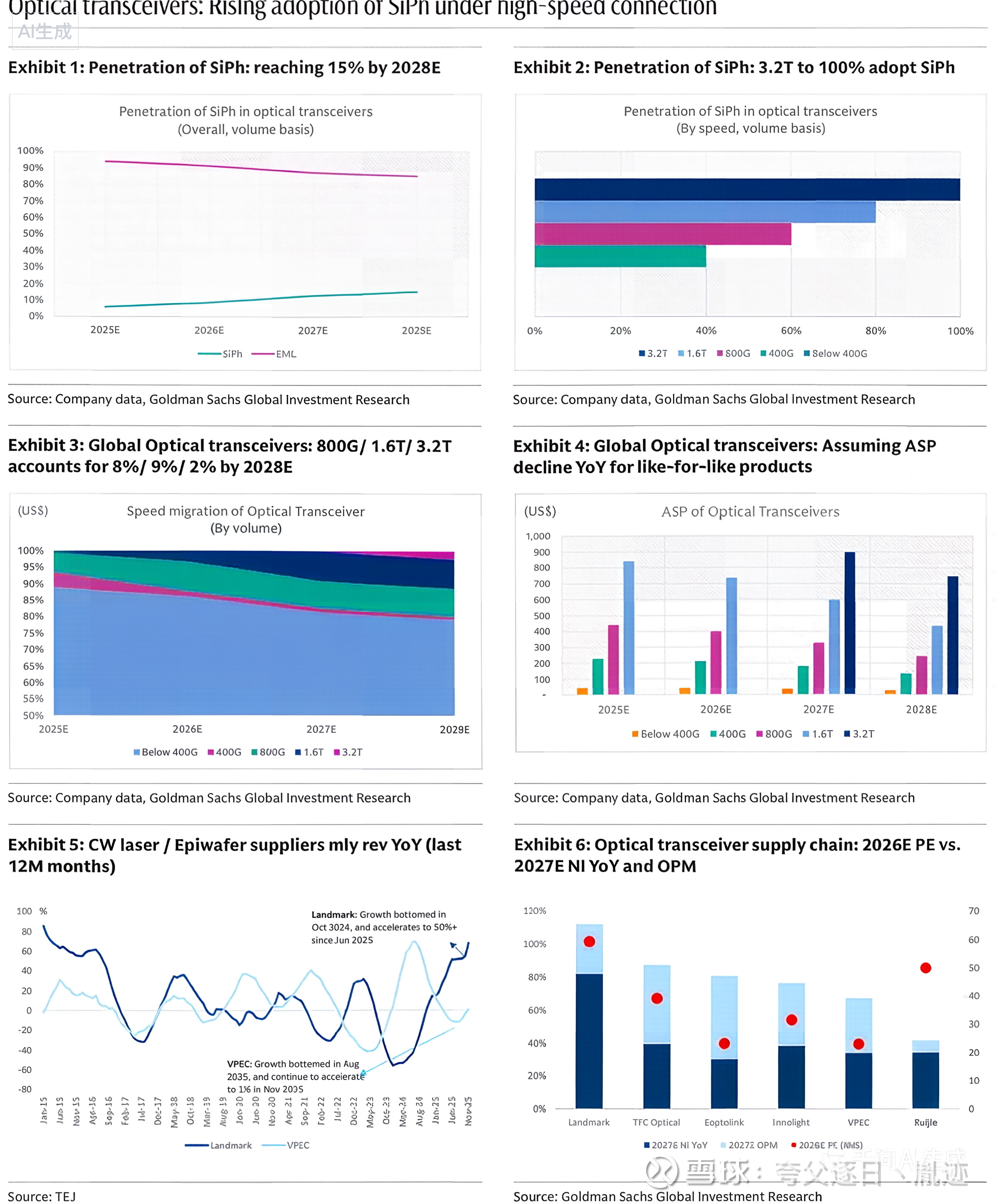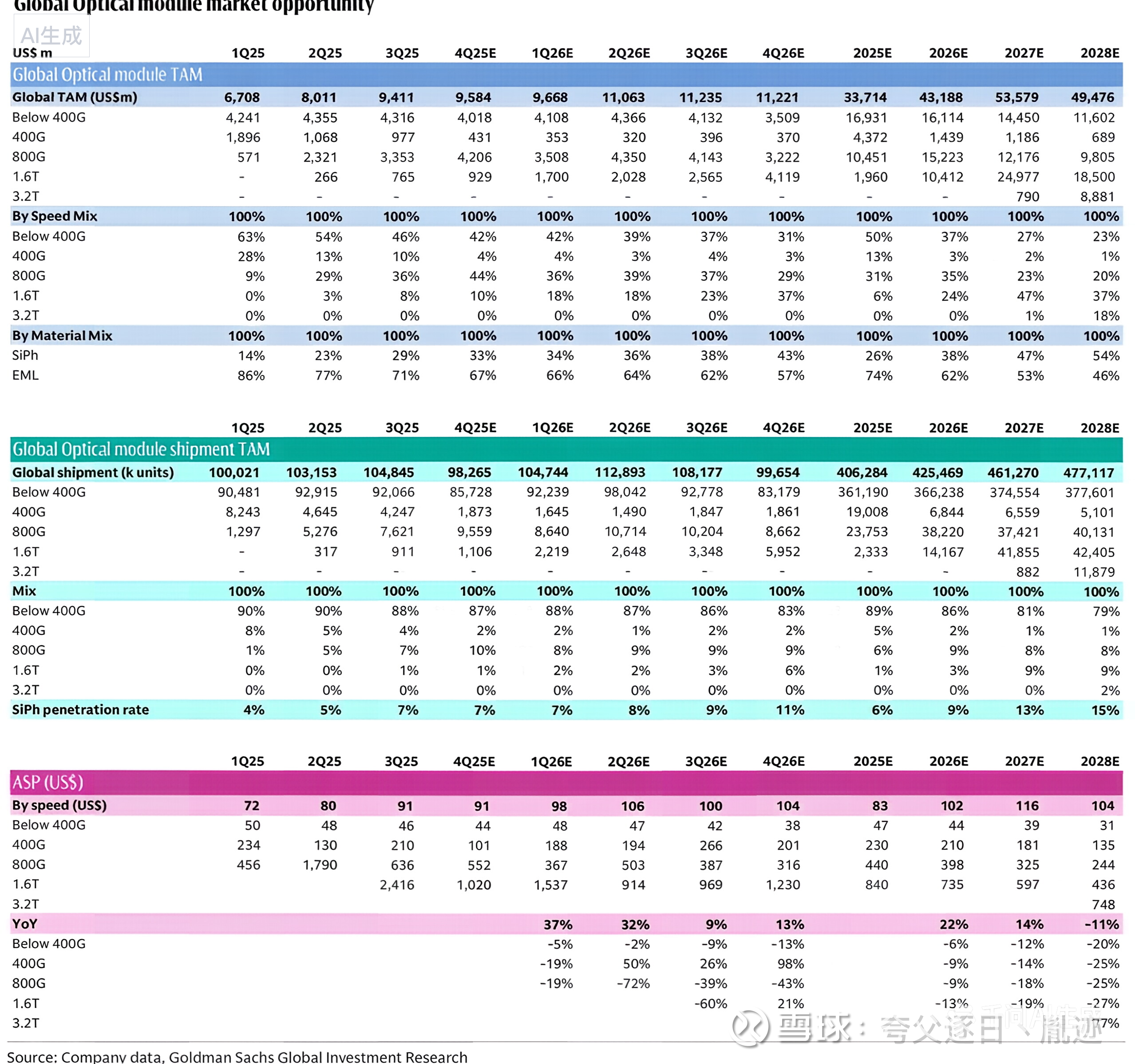 二,产业与情绪,本就是市场的两面镜像: 产业是锚: 高 盛最新研报(附图)上调2026/2027E光模块TAM 43%/46%,800G/1.6T光模块需求爆发(2026E 3800万/1400万只,2028E 9400万只,CAGR 34%),硅光渗透率加速(2028E 15%)、英 伟 达GB300/Rubin架构迭代驱动单GPU光连接量倍增(从1.6只跃升至5只),ASIC服务器崛起(2026E渗透率50%)进一步推高网络需求——光模块行业的高增长赛道属性,并未改变。