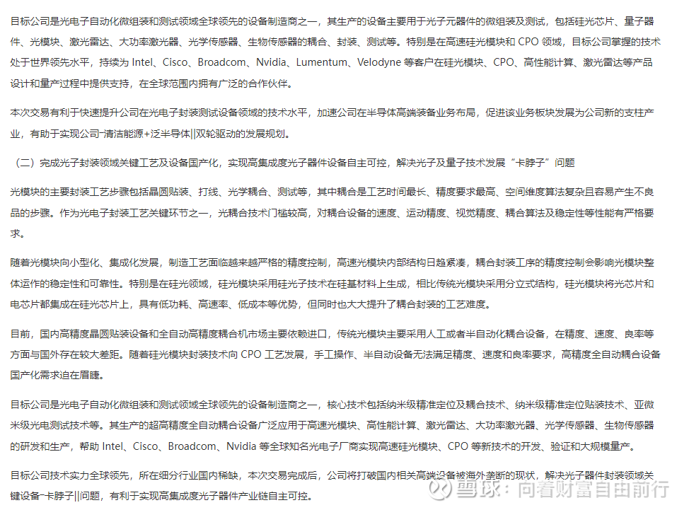 硅光技术难在哪里?再看看公司公告,尽管硅基光电子发展迅猛,但由于其工艺复杂性和硅材料的天然特性,硅基光电子技术仍然面临着不小的挑战,其中重要的一点就包括光纤和波导的高效耦合、封装。传统的光模块采用自由空间的设计方式,对于封装耦合的精度要求较低,通常采用人工或半自动耦合的方式,封装的成本较低。硅光模块集成度高,封装难度大,硅光子封装的两个主要挑战是尺寸适应(因为光纤直径为 125 微米,而集成波导的直径只有几微米)和模态适应,其耦合对准与封装的精度要求高,较难实现高质量、低成本的封装。因此,传统耦合封装方式无法满足硅光模块的大规模生产需要,必须采用高精度的自动耦合封装设备保障封装精度、良率和效率,降低生产成本。根据 Yole,目前阶段在硅光模块成本中,硅光芯片仅占约 10%,封装成本占比约为 80%(注:需要萝卜设备去替代人工降本)。硅光芯片发展的同时也推动了高精度全自动耦合封装设备的发展,两者互相促进。硅光芯片的耦合封装方案不尽相同,因此设备提供商往往较早就介入硅光模块的设计过程,通过共同设计和验证来保证耦合封装设备能够满足大规模量产的需求。随着封装在硅光电子产业中扮演越来越重要的角色,相关公司不仅是设备提供商也正在成为服务和技术提供商,这种技术涉及到包括光纤耦合、共晶贴装和光电测试等众多领域。目前,全球范围内能够提供满足硅光和 CPO 产品耦合、封装、测试需求的设备供应商较少,目标公司 ficonTEC 是主要供应商之一,能够提供全方位的耦合、封装、测试设备解决方案,是 Intel 硅光方案和 Broadcom CPO 方案的主要合作伙伴之一。