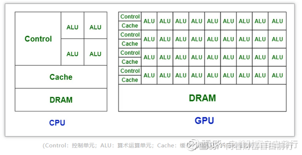 XPU里面核心是三种模块,控制、计算、存储,分别对应下图的 control、ALU、cache(闪存)/dram(内存)
