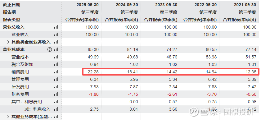 那就直接打开季度利润表,对比下历年的销售百分比: