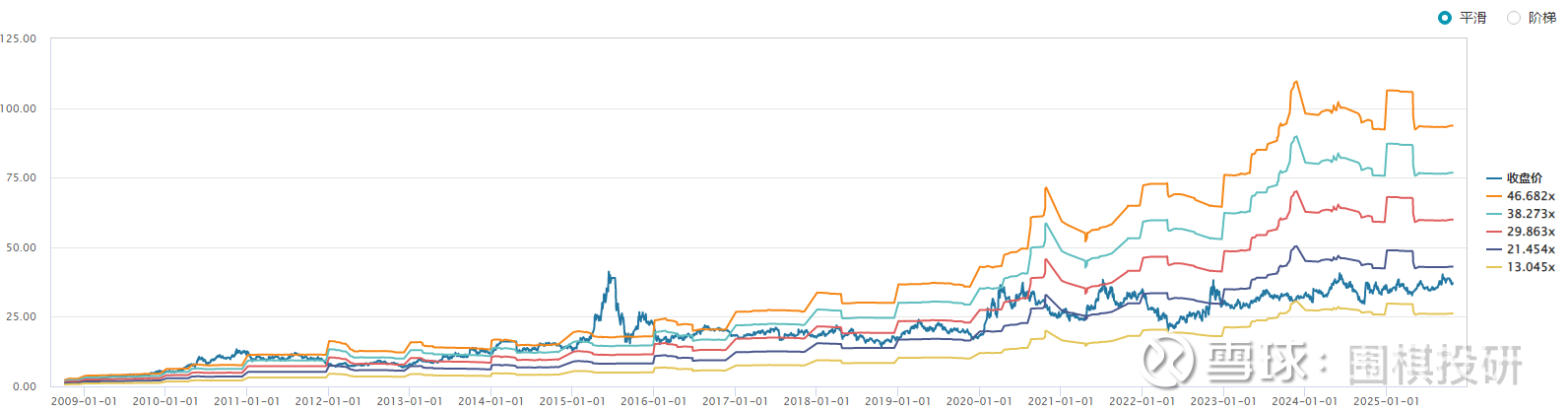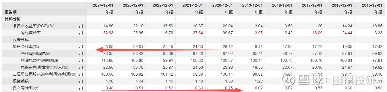 ROE就直接以年度为单位了,稍微看得长期一些,10年维度。除了2020-23年有“特殊事件”影响比较高,长期还算是稳定。拆分因子看,净利率基本就稳在20%以上了,周转率近几年略有下降,杠杆率一直保持稳定。
