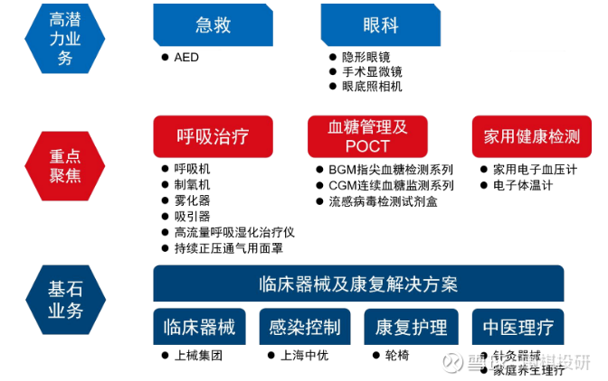一方面,业务线重点聚焦在呼吸治疗、血糖管理和家用健康检测,下有临床器械及康复解决方案为基石,上有积极孵化的急救和眼科等高潜力业务。