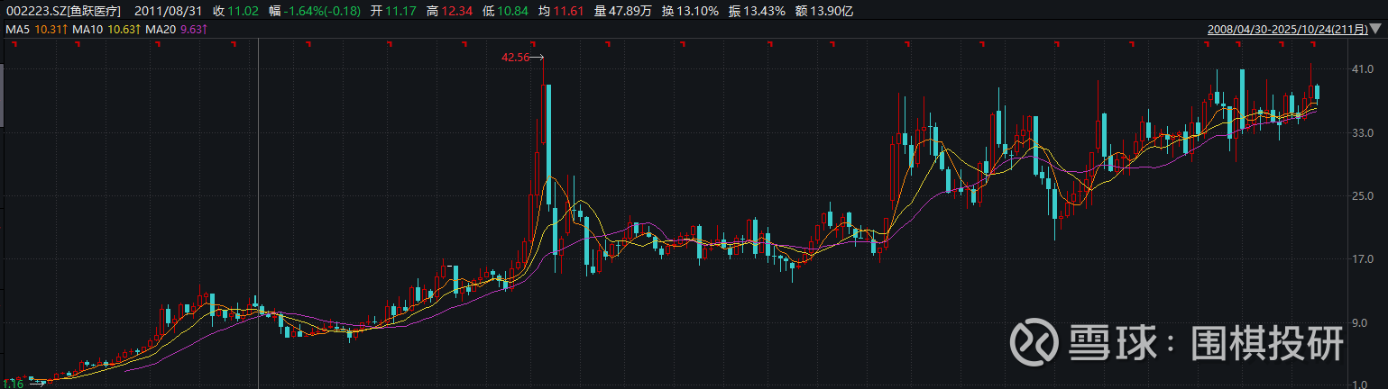 不看不知道,一看吓一跳。鱼跃医疗上市以来的股价走势,没想到是长牛股的样子,如果剔除2015年的“顶尖尖”,持股体验也很不错,大概算了下上市以来的年化收益率有19.2%,很吓人。