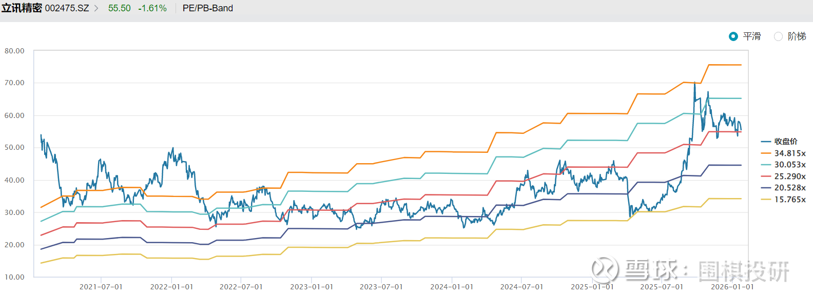 落实到投资维度,立讯可能不太符合我自己的投资体系,定性维度要看客户脸色,定量维度盈利能力偏低。但如果有投资者偏好这类商业模式也完全没问题,可以参考下过去5年的估值,基本就是在15-30倍PE区间波动。