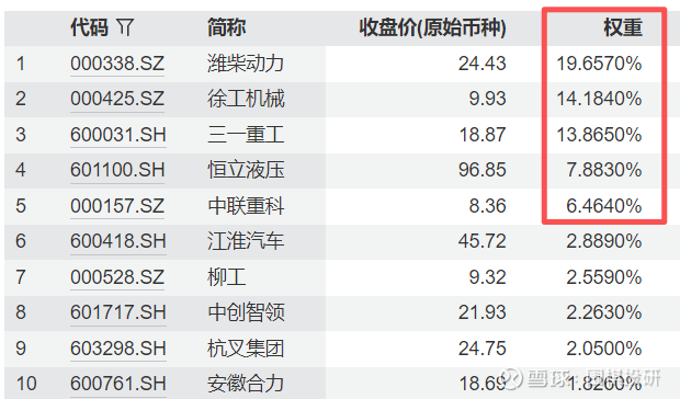 工程机械ETF跟踪的是中证工程机械主题指数,打开重仓股名单就能发现,前五大持仓合计占比能达到60%,仓位很集中。