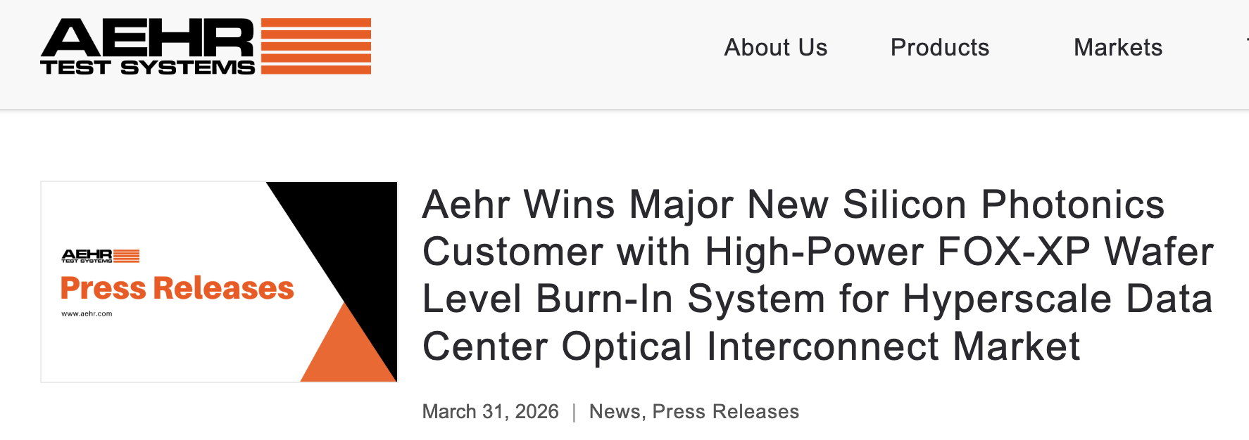 就在刚刚,美股光通信设备商Aehr Test Systems(AEHR)宣布:获得一家“全球网络产品领导者、数据中心光收发器市场主要供应商”的大额订单,采购其FOX-XP硅光子晶圆级老化测试系统,用于超大规模AI和云数据中心的高速光纤互连。首批设备将于2026年Q4交付。