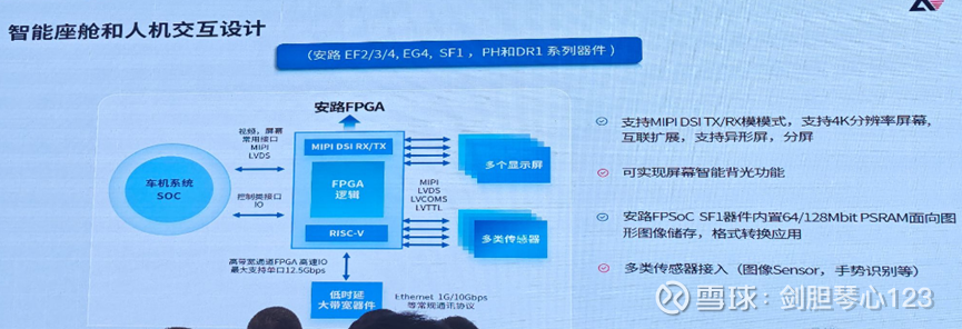 2、智能座舱和多屏显示与驱动:FPGA可以灵活地实现多路视频信号的切换、合成和驱动,支持不同分辨率、不同接口的显示屏,满足座舱内日益增长的需求。另外是车载信息娱乐系统功能桥接,作为不同接口和协议之间的“翻译官”,例如连接主SoC和特定的外设。