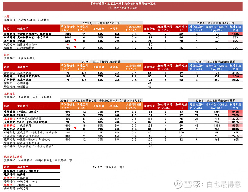 再看公司在卫星里的价值量。卫星最大的价值量是卫星载荷(占整星成本50%-70%)。铖昌是做TR芯片的(占整星成本15%-20%),是国内唯一量产星载相控阵T/R芯片民企,所以这块按照远端空间拍,空间很大。下面附上最新的空间测算图。