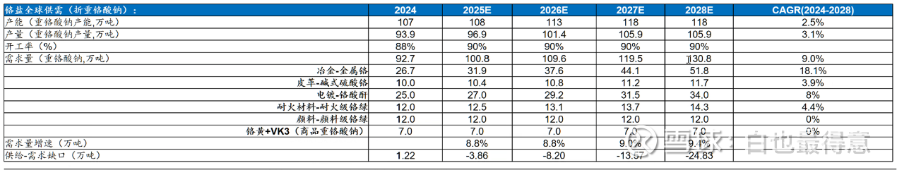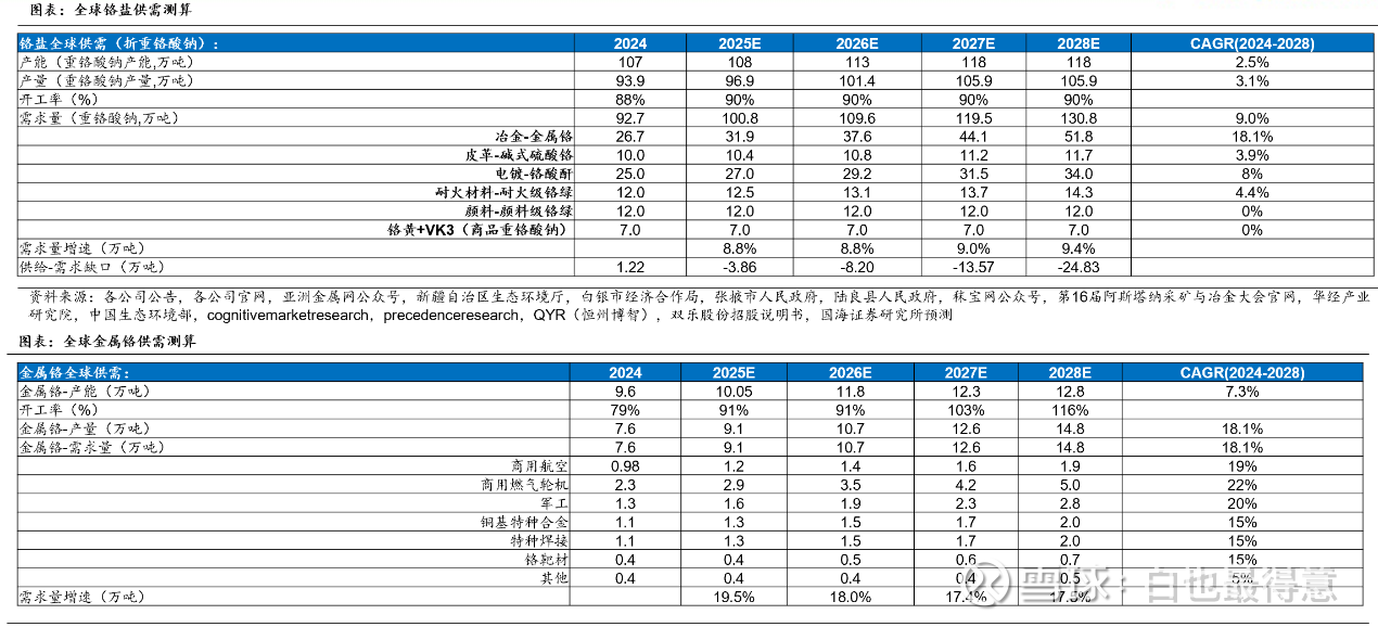 2)供给端:制造金属铬的原材料是重铬酸钠,重铬酸钠→冶金级氧化铬绿→金属铬。