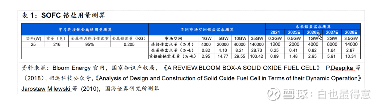1)需求端:北美缺电燃气轮机需求爆发,高温合金需要金属铬(第一张表)。还有一块没有体现,就是缺电带动SOFC的需求(第二张表),SOFC的中间体要用金属铬,这块的量很大,会继续扩大第一张表中的供需缺口。