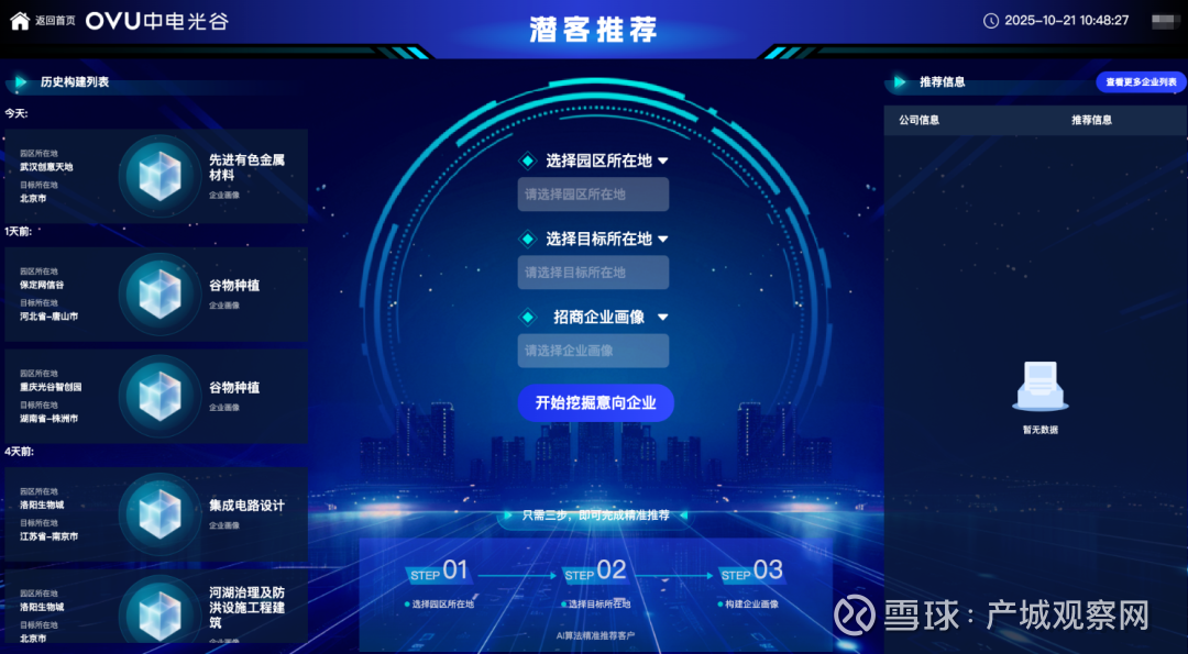 这些工具共同构建了轻资产服务的智能化底座,提升园区运营效率与企业服务体验。而这一底座的核心价值,正通过AI 与大数据赋能的具体场景充分释放,其中AI 招商系统便是典型代表:OVU园区操作系统整合产业大数据,驱动跨区域协同招商,通过AI智能匹配与管理,实现客户追踪、合同签约一体化,借助OVU招商网在线选址,全面提升招商效率和成果转化。这种以AI与大数据为核心,从多元客户需求出发,构建起的数字化产业生态体系,驱动园区从被动空间提供者向主动价值引擎跃迁。