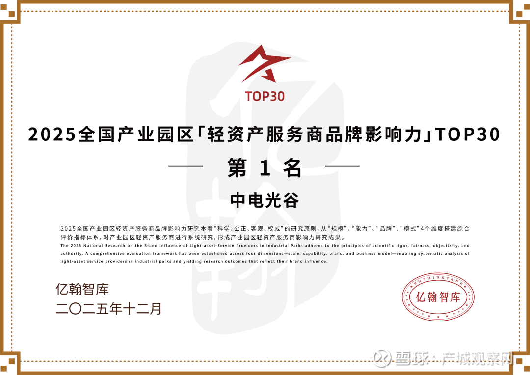 2025年12月10日-13日,由亿翰智库、广电产业园·广州新一代公司联合主办,园动力产业发展、中国民生银行广州分行协办的“向新而行,固本致远——2025产业园区创新发展大会”成功举办。期间重磅发布《2025产业园区优秀案例研究成果》,其中,中电光谷以显著优势斩获“2025全国产业园区轻资产服务商品牌影响力TOP30”第一名,这一荣誉是基于“规模、能力、品牌、模式” 四大维度的科学评估,更彰显了其在轻资产服务领域的综合领跑实力。