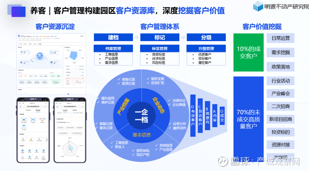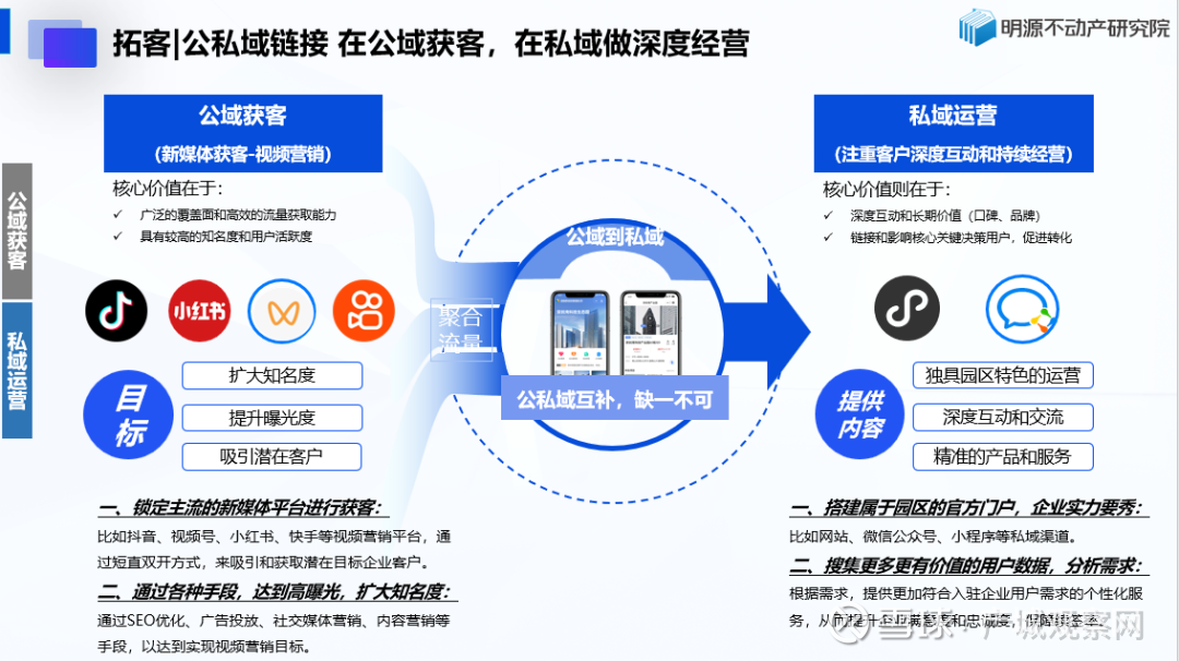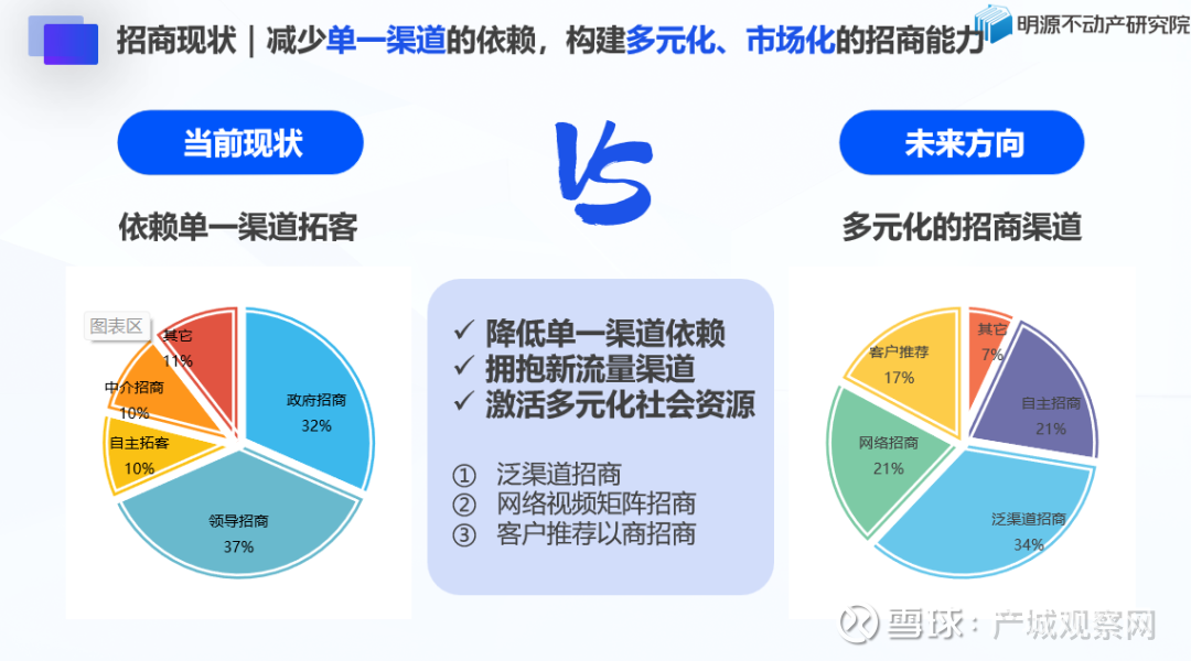 与此同时,我们的竞争对手也在积极变革。过去的模式是“修好载体再招商”,容易导致载体与客户需求不匹配。现在则转变为“带凤筑巢”,即先锁定目标产业和企业,再为其定制载体。过往依赖政府和“坐等”的招商模式已经失灵,倒逼企业转向自主招商(主动出击)、泛渠道招商(借助基金、投行等分散资源)和网络招商(线上获客)等招商模式。其中,典型企业如中南高科,其网络招商占比已达16%,充分表明线上获客的渠道已经是不可忽视的趋势。