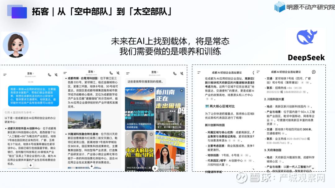 未来,企业会习惯通过豆包、DeepSeek等AI工具搜索园区信息。我们需要提前在这些平台“喂养”园区信息,确保当AI被问及“适合AI企业的园区”时,能推荐我们的项目,这也要求我们需要坚持在公域进行内容布局。