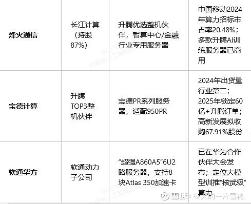 高新发展(000628):通过控股华鲲振宇(持股70%)成为升腾整机市占率第一厂商(约50%),是字节跳动2026年12–13万张升腾950芯片采购计划的核心供应商;拟收购宝德计算67.91%股份,进一步整合TOP3整机产能。神州数码(000034):升腾全球最大分销商+自有品牌“神州鲲泰”整机商,2024年升腾芯片销售额增速达120%,武汉超节点建设项目核心服务商(8.6亿元采购额),2025年产能将提升至50万台。烽火通信(600498):通过子公司长江计算深度绑定升腾,为华为升腾优选级合作伙伴,2024年中国移动算力招标中市占率达20.48%,聚焦智算中心与金融行业。宝德计算:升腾服务器TOP3核心伙伴(2024年出货量行业第二),年产20万台AI服务器,2025年已锁定60亿+升腾订单;高新发展收购完成后将强化其整机交付能力。软通华方(软通动力子公司):发布“超强A860A5”6U2路AI服务器,支持8块Atlas 350加速卡,定位“核武级”大模型训推一体算力。