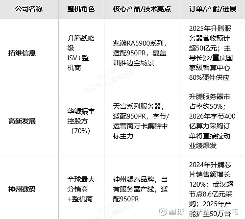 当前升腾950PR服务器整机产业链已形成**“整机龙头+配套强链+生态协同”** 的成熟格局:拓维信息、高新发展、神州数码构成第一梯队,订单饱满、产能明确、客户覆盖互联网/运营商/政务三大主力场景;烽火通信、宝德计算、软通华方紧随其后,分别在行业定制、产能整合、训推一体方向形成差异化优势。需注意,部分公司如高新发展存在资产注入进度风险,而神州数码则兼具分销稳健性与整机高毛利双重逻辑。
