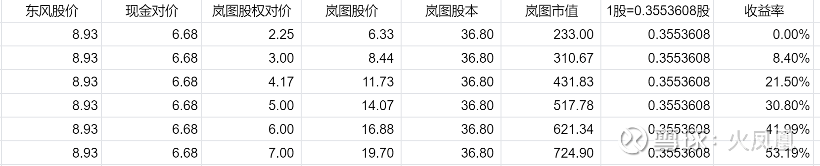 现价买入东风集团,如果岚图汽车股价达到换股方案中的11.73,收益率21%。东风集团现价意味着岚图汽车股价6.33,市值233亿。