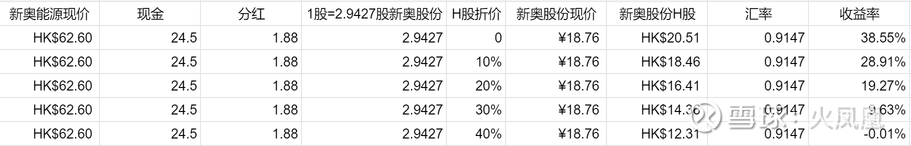 现价买入新奥能源,假设新奥股份A股价格不变,H股上市后折价20%,收益率19%。